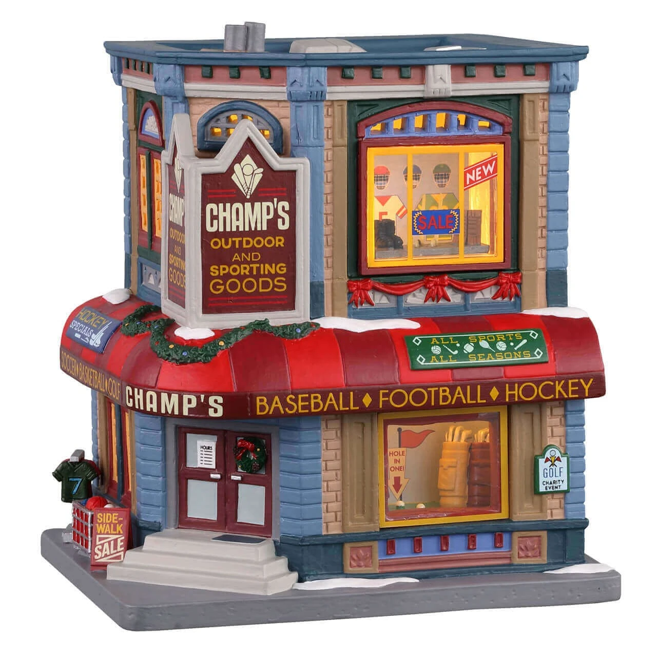 This detailed figurine set showcases “Champ’s Outdoor and Sporting Goods,” a vibrant and bustling store perfect for adding a dynamic touch to your Christmas village. The two-story building is richly adorned with holiday decorations and eye-catching displays.  The exterior is painted in festive colors, featuring a large sign that reads “Champ’s Outdoor and Sporting Goods” prominently on the upper part of the building. The walls are decorated with red garlands and bows, adding holiday cheer to the sporty storefront.
